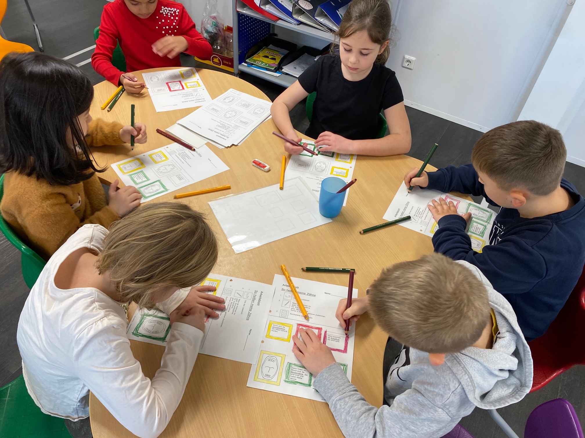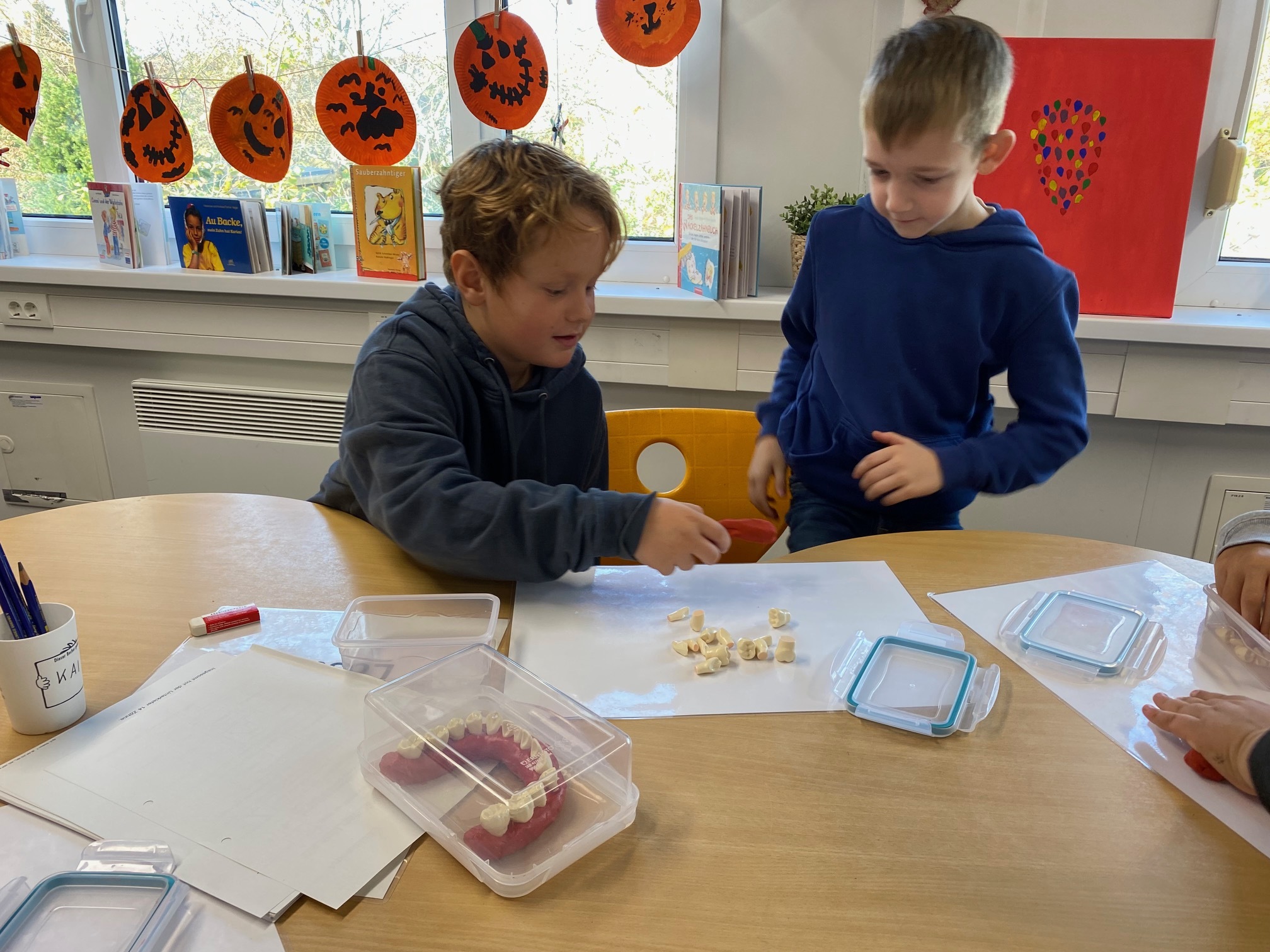 Letzte Woche war Nicole bei uns in der Klasse und hat zwei Stunden zu den Zähnen mit uns gemacht. Wir haben alles vom letzten Jahr wiederholt und die vier Säulen der Zahngesundheit gelernt. Dann konnten wir an die Stationen. Dieses Jahr ging es darum, welche Zähne wir haben. Ganz vorne sind 8 Schneidezähne zum Abschneiden. Dann kommen 4 Eckzähne, die auch Reißzähne heißen können. Löwen reißen damit Fleischstücke aus ihrem Fressen raus. Wir nehmen dazu meistens unser Besteck. Hinten sind 16 Backenzähne, die wir zum Mahlen des Essens benutzen. Später können auch noch 4 Weisheitszähne kommen. An einer Station mussten wir Kunststoffzähne in einen Kiefer aus Knete stecken. Das war nicht einfach. Auch eine Buchstation ab es. Das fand ich interessant. Wie im letzten Jahr haben wir auch an einem großen Modell Zähne geputzt. Wir haben die KAI-Methode gemacht. Es gab noch viele andere Stationen. Besonders gut fand ich die Rätsel.